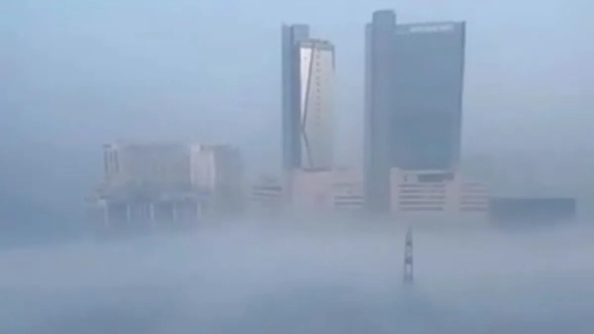 ग्रेटर नोएडा वेस्ट में कोहरे की परत से ऊपर दिखती बहुमंजिला इमारते। सौ. वीडियो ग्रैब