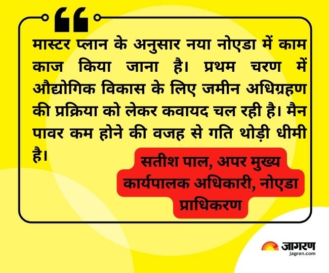 नोएडा प्राधिकरण के अपर मुख्य कार्यपालक अधिकारी सतीश पाल ने कहा कि मास्टर प्लान के अनुसार नया नोएडा में काम काज किया जाना है। प्रथम चरण में औद्योगिक विकास के लिए जमीन अधिग्रहण की प्रक्रिया को लेकर कवायद चल रही है। मैन पावर कम होने की वजह से गति थोड़ी धीमी है।