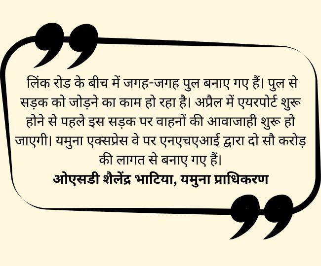 यमुना प्राधिकरण के ओएसडी शैलेंद्र भाटिया का कहना है कि लिंक रोड के बीच में जगह-जगह पुल बनाए गए हैं। पुल से सड़क को जोड़ने का काम हो रहा है। अप्रैल में एयरपोर्ट शुरू होने से पहले इस सड़क पर वाहनों की आवाजाही शुरू हो जाएगी। यमुना एक्सप्रेस वे पर एनएचएआई द्वारा दो सौ करोड़ की लागत से बनाए गए हैं।
