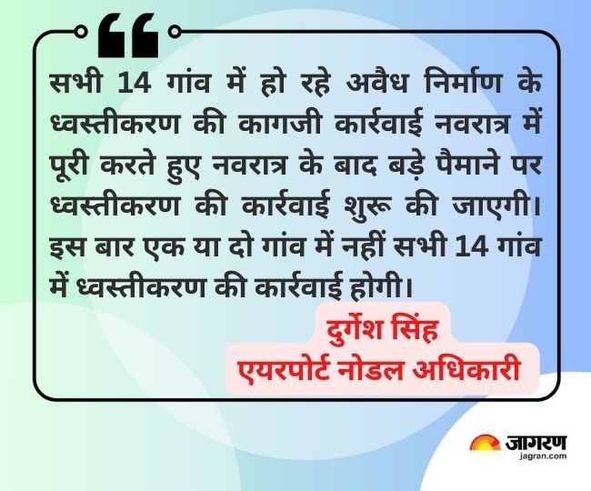 इस संबंध में एयरपोर्ट नोडल अधिकारी दुर्गेश सिंह ने बताया कि सभी 14 गांव में हो रहे अवैध निर्माण के ध्वस्तीकरण की कागजी कार्रवाई नवरात्र में पूरी करते हुए नवरात्र के बाद बड़े पैमाने पर ध्वस्तीकरण की कार्रवाई शुरू की जाएगी। इस बार एक या दो गांव में नहीं सभी 14 गांव में ध्वस्तीकरण की कार्रवाई होगी। किसी भी अवैध निर्माण करने वाले को अनुचित लाभ नहीं लेने दिया जाएगा।