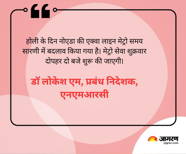 होली के दिन नोएडा की एक्वा लाइन मेट्रो समय सारणी में बदलाव किया गया है। मेट्रो सेवा शुक्रवार दोपहर दो बजे शुरू की जाएगी।