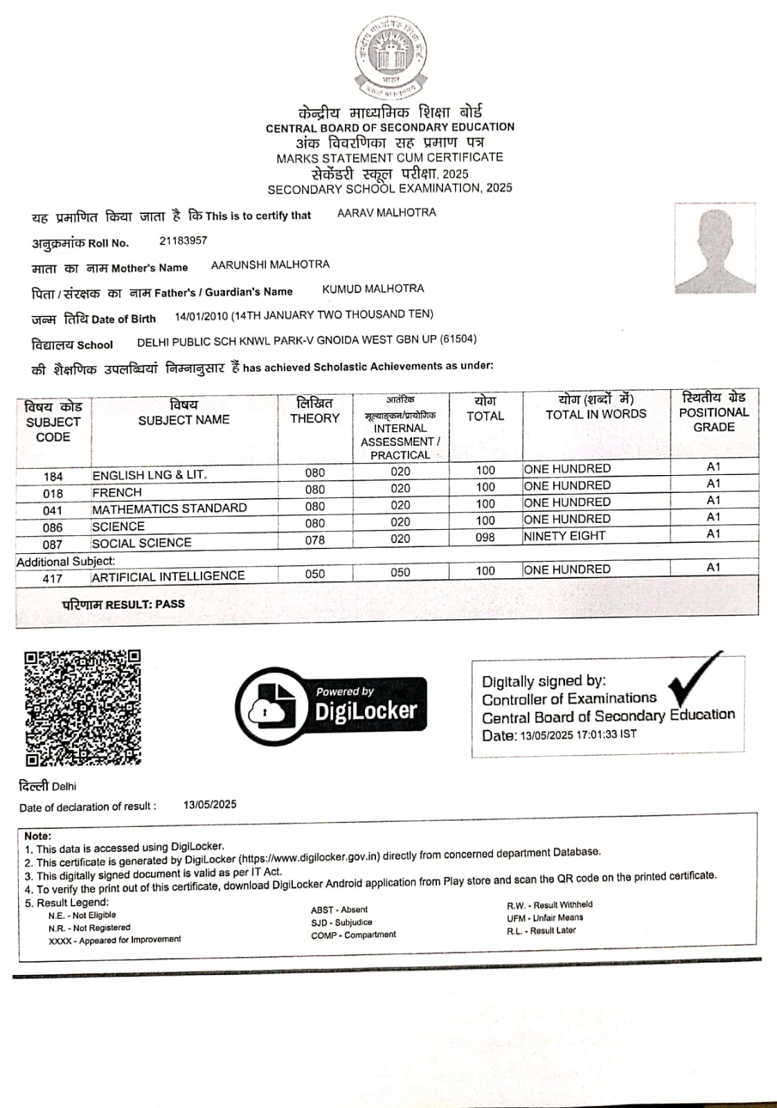 ग्रेटर नोएडा वेस्ट स्थित डीपीएस स्कूल के 10 वीं के छात्र आरव मल्होत्रा ने बेस्ट फाइव सब्जेक्ट में 500 में से 500 अंक प्राप्त किए