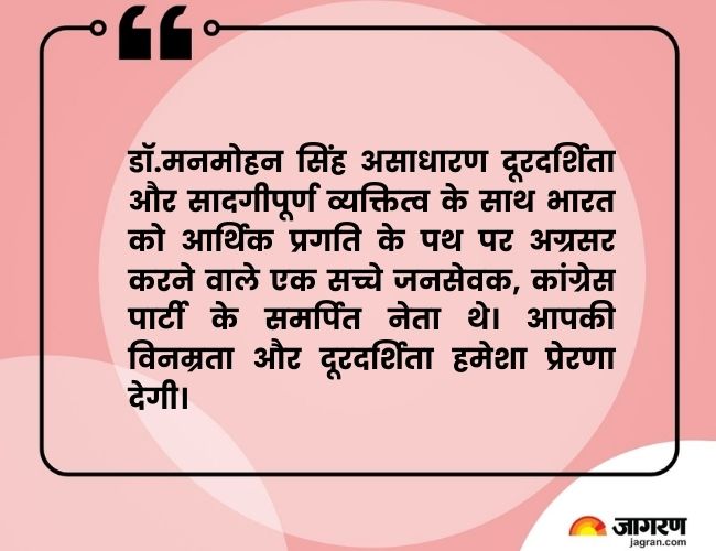 उन्होंने कहा कि वह असाधारण दूरदर्शिता और सादगीपूर्ण व्यक्तित्व के साथ भारत को आर्थिक प्रगति के पथ पर अग्रसर करने वाले एक सच्चे जनसेवक, कांग्रेस पार्टी के समर्पित नेता थे। आपकी विनम्रता और दूरदर्शिता हमेशा प्रेरणा देगी।