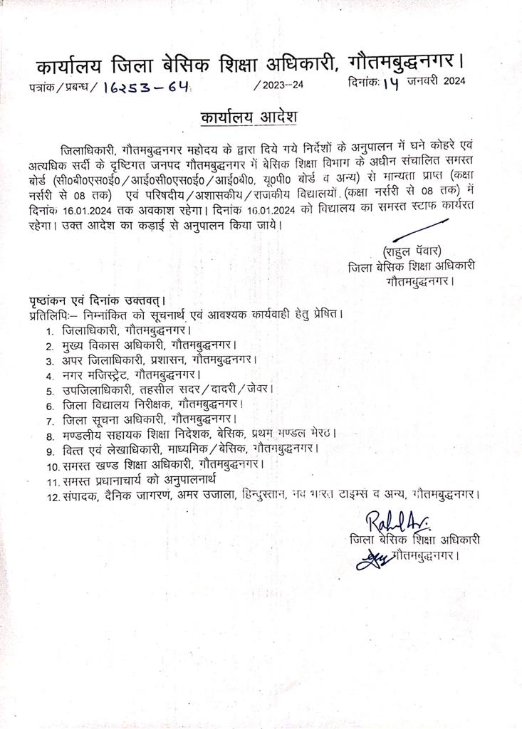 जिला बेसिक अधिकारी ने नोटिस में लिखा कि घने कोहरे और अत्यधिक सर्दी के कारण सभी बोर्ड से मान्यता प्राप्त स्कूलों में 16 जनवरी तक अवकाश रहेगा। 16 जनवरी को स्कूलों के समस्त स्टाफ कार्यरत रहेगा इसमें लिखा है कि आदेश का कड़ाई से अनुपालन किया जाए।