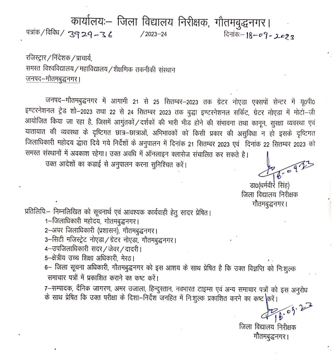 जिला विद्यालयी निरीक्षक ने बताया कि रूट डायवर्जन और सुरक्षा-व्यवस्था को देखते हुए 21 सितंबर दोपहर दो बजे के बाद और 22 सितंबर को पूरे दिन स्कूलों में अवकाश रहेगा। यूपी इंटरनेशनल ट्रेड शो 21 और मोटो जीपी भारत 22 सितंबर से शुरू होगी।