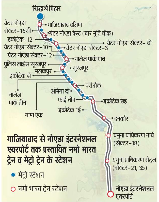 आईजीआई एयरपोर्ट से नोएडा एयरपोर्ट की कनेक्टिविटी के लिए नमो भारत रेल कॉरिडोर की डीपीआर तैयार कराई जा रही है। गाजियाबाद से नोएडा एयरपोर्ट तक कॉरिडोर बनाया जाएगा। इस में नमो भारत रेल व मेट्रो दोनों का परिचालन होगा। हेरिटेज सिटी परियोजना को देखते हुए नमो भारत रेल परियोजना मथुरा तक विस्तारित करने की पत्र शासन को भेजा जाएगा। -डॉ. अरुणवीर सिंह, सीईओ यमुना प्राधिकरण