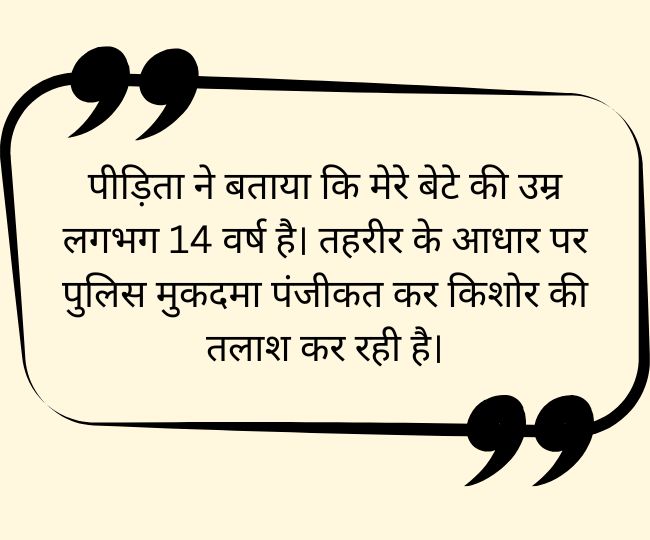 मैं अपने आपको काबू न कर सका और भगवान के स्थान पर जा रहा हूं। मुझे ढूंढने की कोशिश न करें। पीड़िता ने बताया कि मेरे बेटे की उम्र लगभग 14 वर्ष है। तहरीर के आधार पर पुलिस मुकदमा पंजीकृत कर किशोर की तलाश कर रही है।