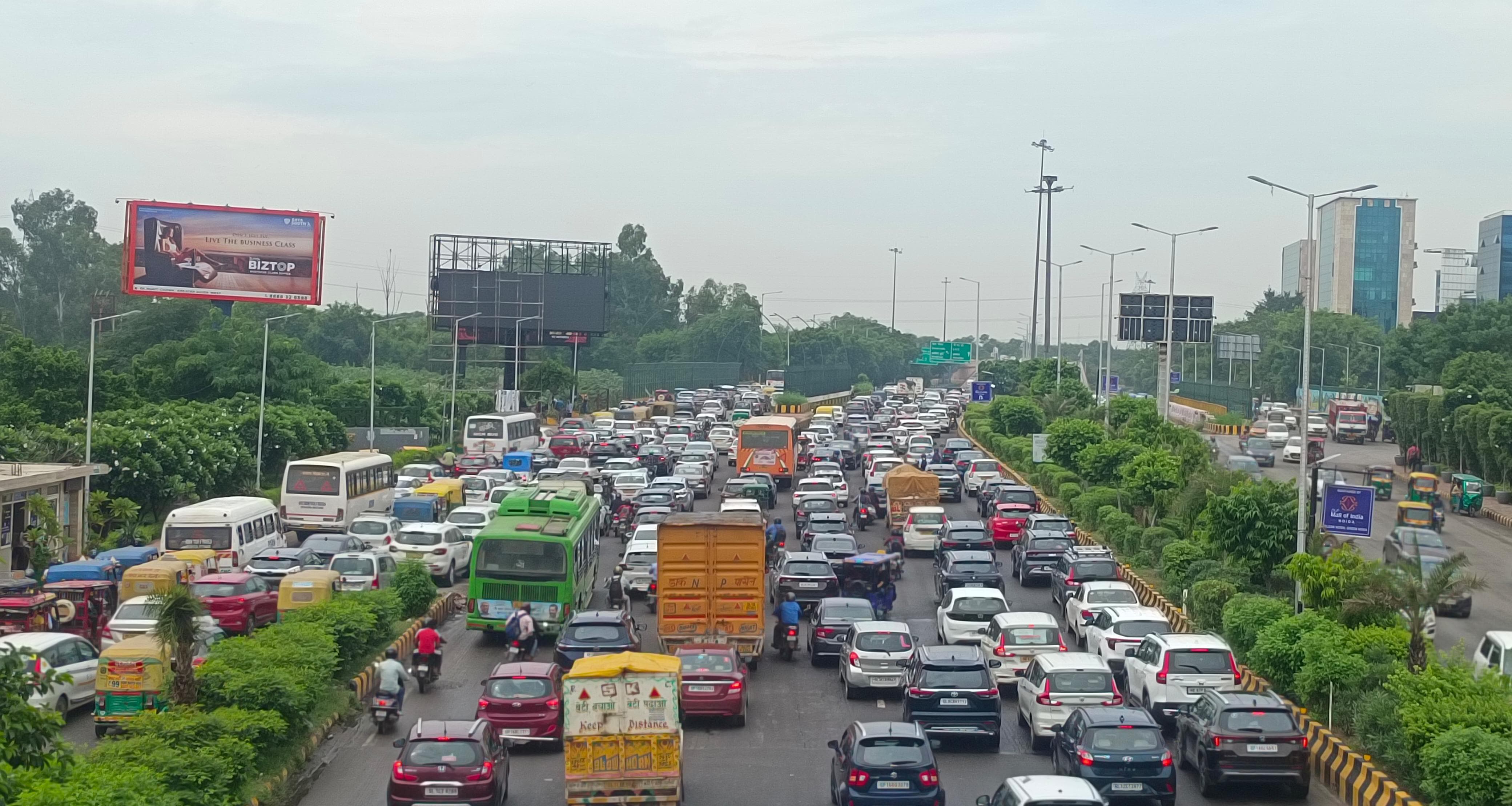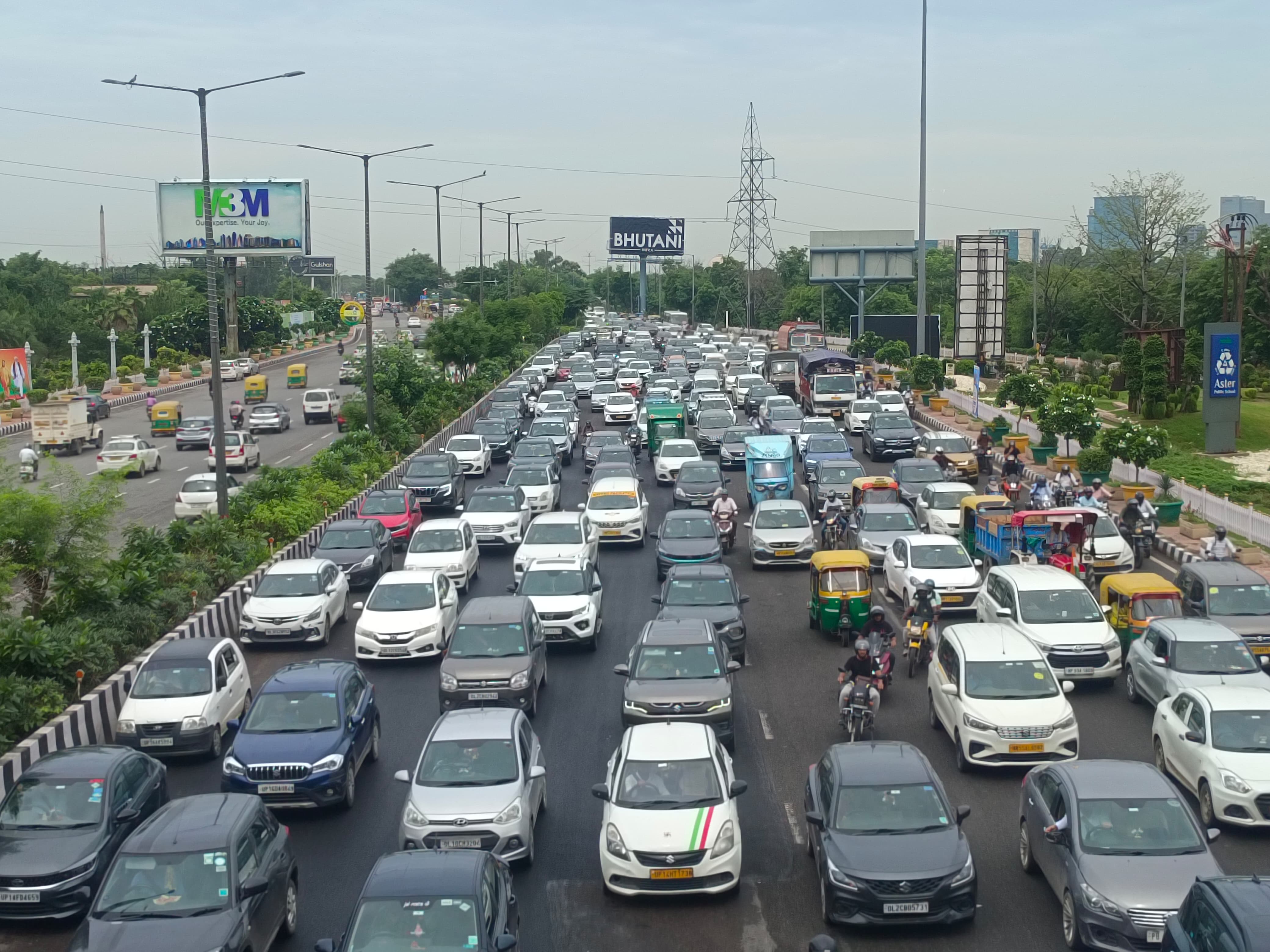 नोएडा एक्सप्रेस-वे पर ग्रेटर नोएडा जाने वाले मार्ग पर लगे जाम में फंसे वाहन।