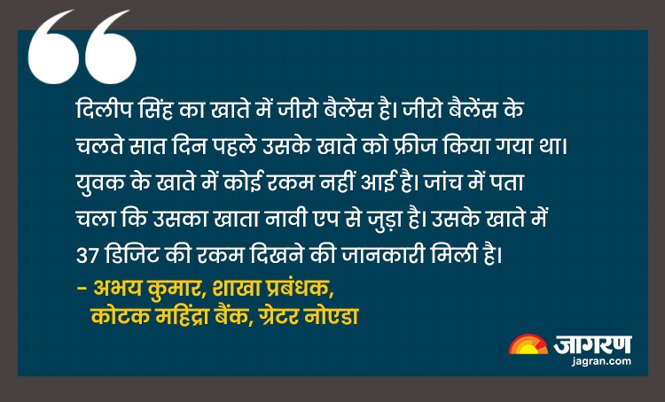 युवक का खाता मोबाइल एप नावी से लिंक है। नावी एप पर ही बैलेंस चेक करने पर दिलीप को 37 डिजिट की रकम दिखी थी। इसलिए बैंक में रुपये निकालने पहुंचा था। पुलिस जांच में टेक्निकल ग्लिच से नावी एप पर ही रकम दिखने की बात सामने आई।