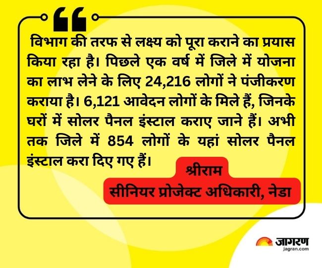 6,121 आवेदन लोगों के मिले हैं, जिनके घरों में सोलर पैनल इंस्टाल कराए जाने हैं। अभी तक जिले में 854 लोगों के यहां सोलर पैनल इंस्टाल करा दिए गए हैं। बताया कि योजना के तहत आवेदक ने जितने किलोवाट का बिजली कनेक्शन ले रखा है। उतने किलोवाट के बिजली उत्पादन के लिए सोलर पैनल इंस्टाल किया जाता है।