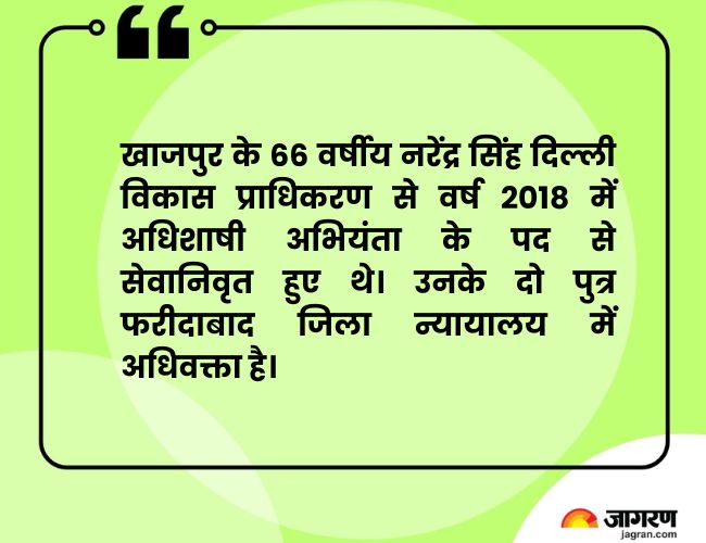 खाजपुर के 66 वर्षीय नरेंद्र सिंह दिल्ली विकास प्राधिकरण से वर्ष 2018 में अधिशाषी अभियंता के पद से सेवानिवृत हुए थे। उनके दो पुत्र फरीदाबाद जिला न्यायालय में अधिवक्ता है। नरेंद्र सिंह अपनी पत्नी के साथ बल्लभगढ़ में रहते थे।