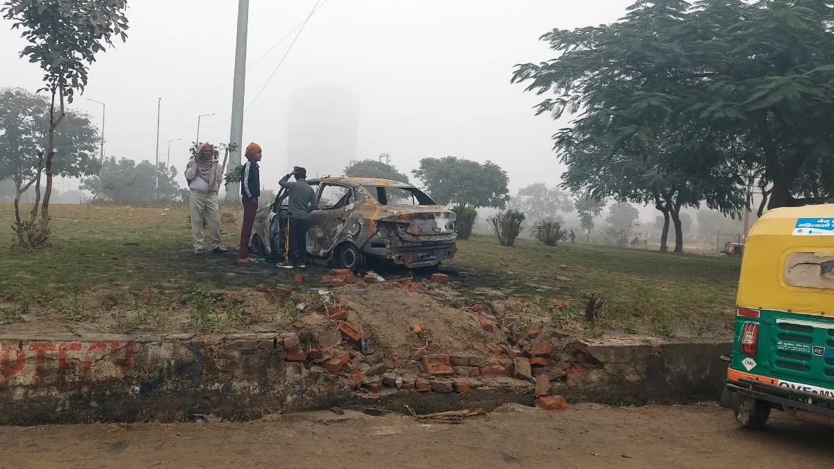 नोएडा में घने कोहरे में गाेलचक्कर से टकराई कार में लगी आग, गाड़ी सवारों ने कूद कर बचाई जान