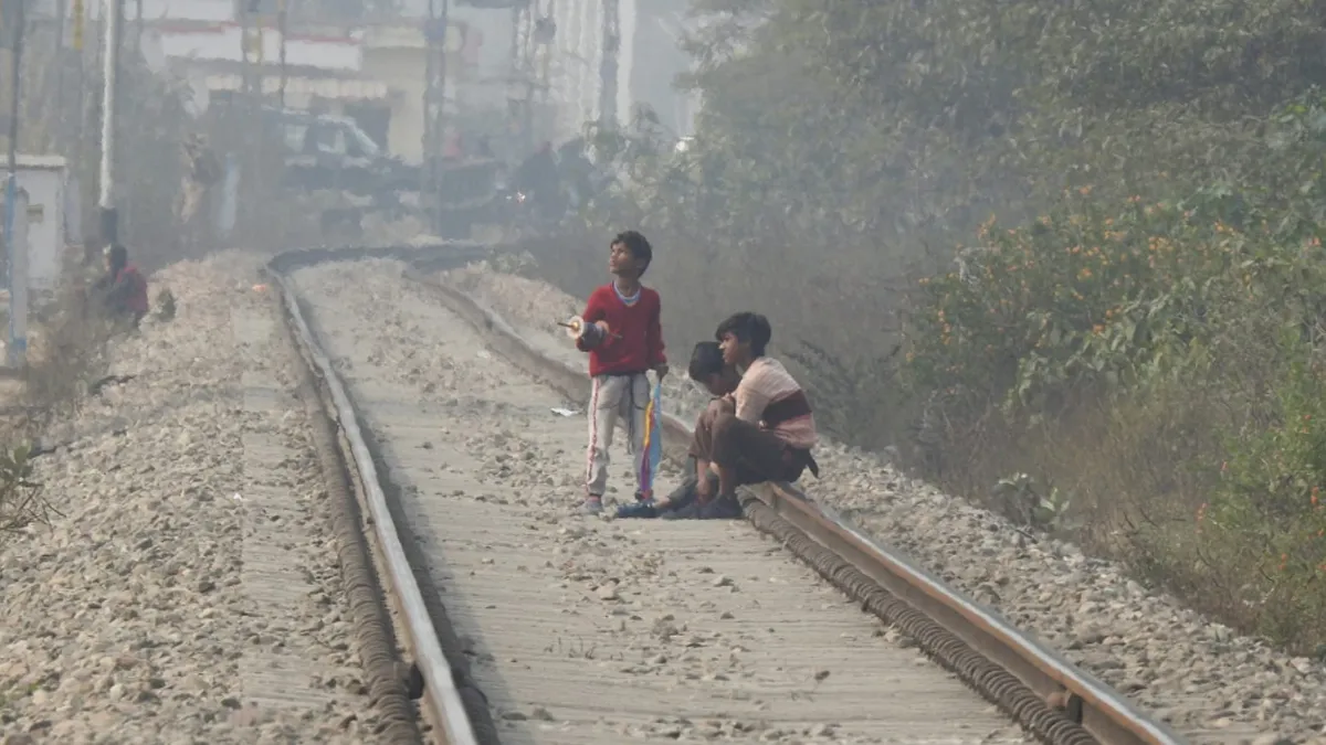 रेलवे ट्रैक पर पतंग उड़ाते बच्चे