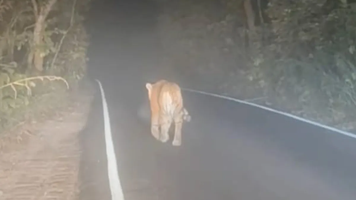 आगे-आगे वनराज, पीछे कारों का कारवां: बीच सड़क पर आया बाघ, देखें रोमांचक मंजर