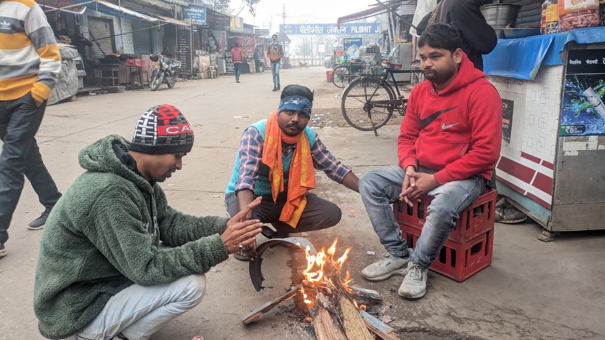 पीलीभीत शहर में शनिवार की सुबह सर्दी से बचाव के लिए आग जलाकर तापते लोग। जागरण
