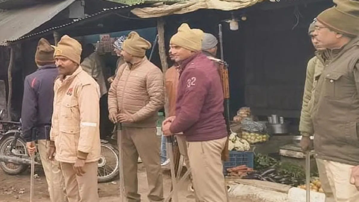 मासूम बालिका से दुष्कर्म के बाद शांति व्यवस्था बनाए रखने के लिए प्रतापगढ़ के उड़ैयाडीह बाजार में तैनात पुलिस। जागरण।
