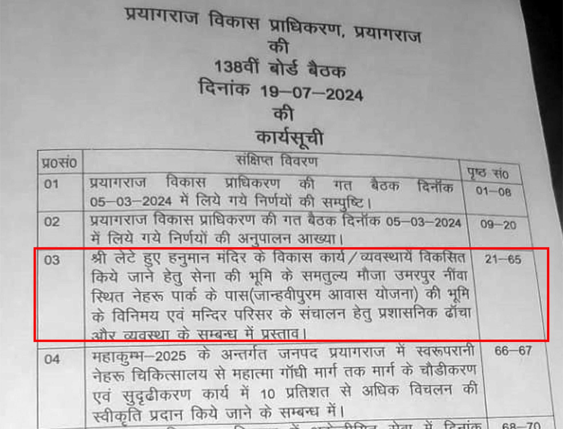 Bade Hanuman Mandir Prayagraj महाकुंभ के दृष्टिगत तीर्थराज में हनुमान मंदिर अक्षयवट व महर्षि भरद्वाज कारिडोर का निर्माण होना है। हनुमान मंदिर कारिडोर पर लगभग 45 करोड़ रुपये खर्च किए जाएंगे। बोर्ड की बैठक में इस प्रस्ताव पर मुहर लग गई कि रक्षा मंत्रालय की शर्तों के आधार पर ही हनुमान मंदिर कॉरिडोर के लिए सेना से जमीन ली जाएगी।