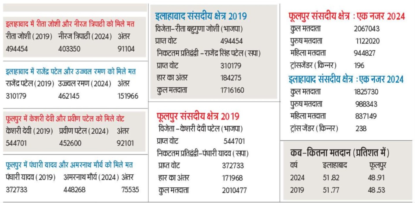 इलाहाबाद में 2019 में जहां सपा के राजेंद्र पटेल को 310179 मत मिले थे तो वहीं इस बार सपा-कांग्रेस गठबंधन के प्रत्याशी उज्ज्वल ने अच्छी-खासी बढ़त बनाई। फूलपुर में पिछले चुनाव में मैदान में रहे पंधारी यादव से इस बार अमरनाथ सिंह मौर्य को काफी ज्यादा वोट मिले, हालांकि वह चुनाव हार गए।