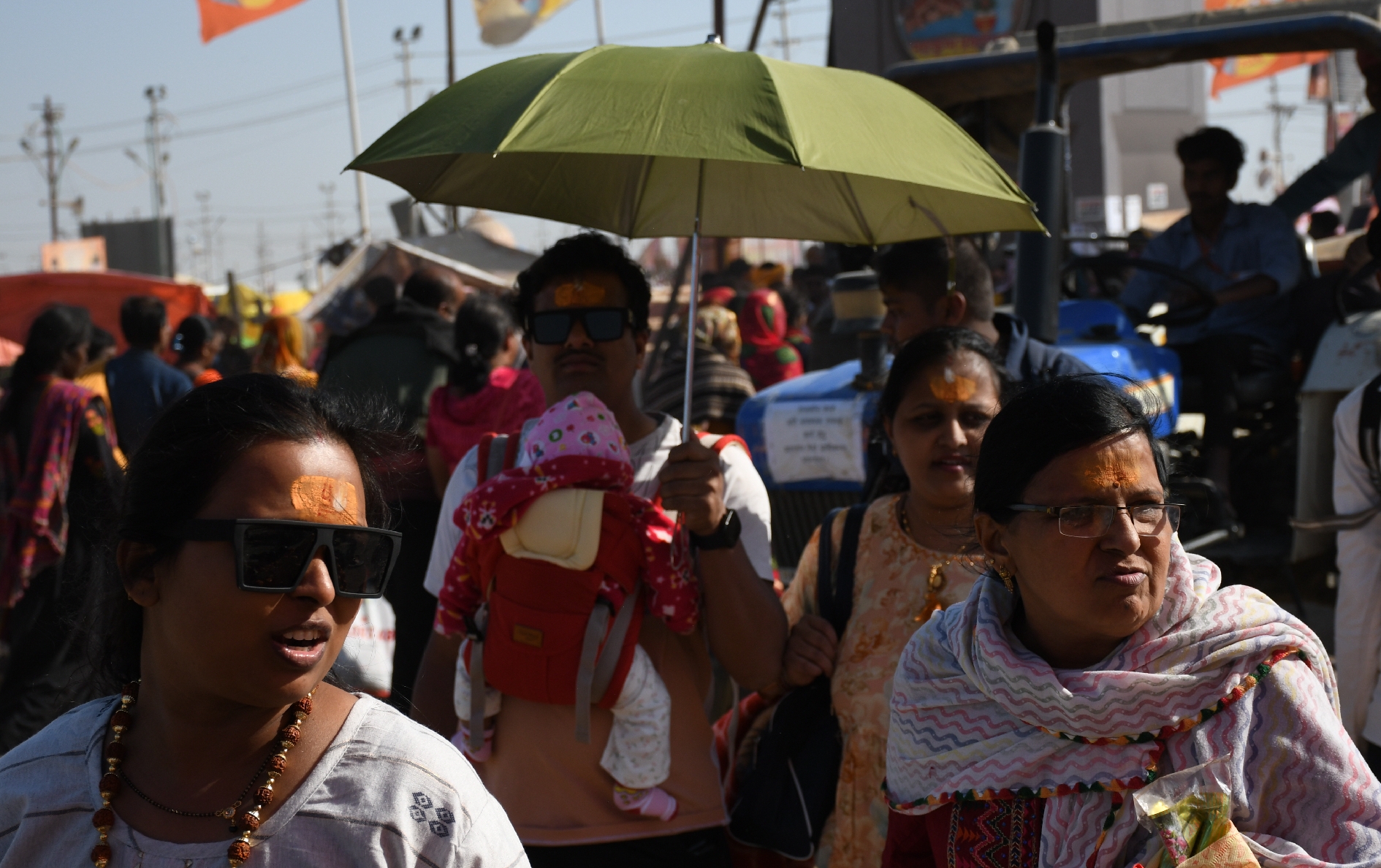 महाकुंभनगर (Maha Kumbh Mela 2025) के संगम अपर मार्ग पर धूप से बचने के लिए छाता की सहारा लेकर संगम स्नान के लिए जाते श्रद्वालु। मुकेश कनौजिया