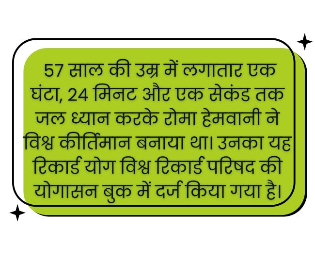 बीते वर्ष दिसंबर महीने में राजधानी लखनऊ में 57 साल की उम्र में लगातार एक घंटा, 24 मिनट और एक सेकंड तक जल ध्यान करके रोमा हेमवानी ने विश्व कीर्तिमान बनाया था। उनका यह रिकार्ड योग विश्व रिकार्ड परिषद की योगासन बुक में दर्ज किया गया है।