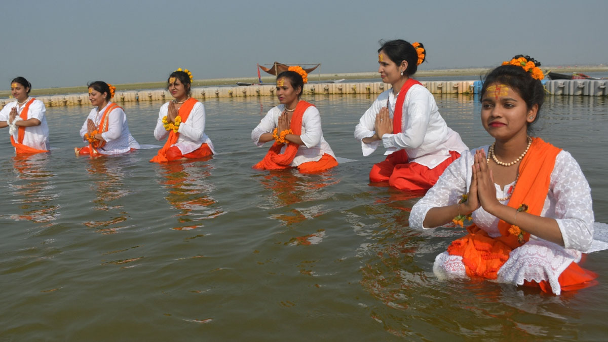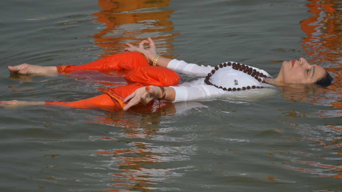 जूड़े और कलाई पर पीत पुष्प। तन पर श्वेत, भगवा वस्त्र धारण किए आठ योगा प्रशिक्षु वीरभद्र आसान के साथ शंखनाद करती हैं। साथ ही जल धारा में प्रवेश करती हैं विश्व जल योग रिकार्डधारी रोमा हेमवानी। तालियों से अभिनंदन के साथ प्लावनी मुद्रा में वह जल तरंगों पर स्वयं को समर्पित कर देती हैं।