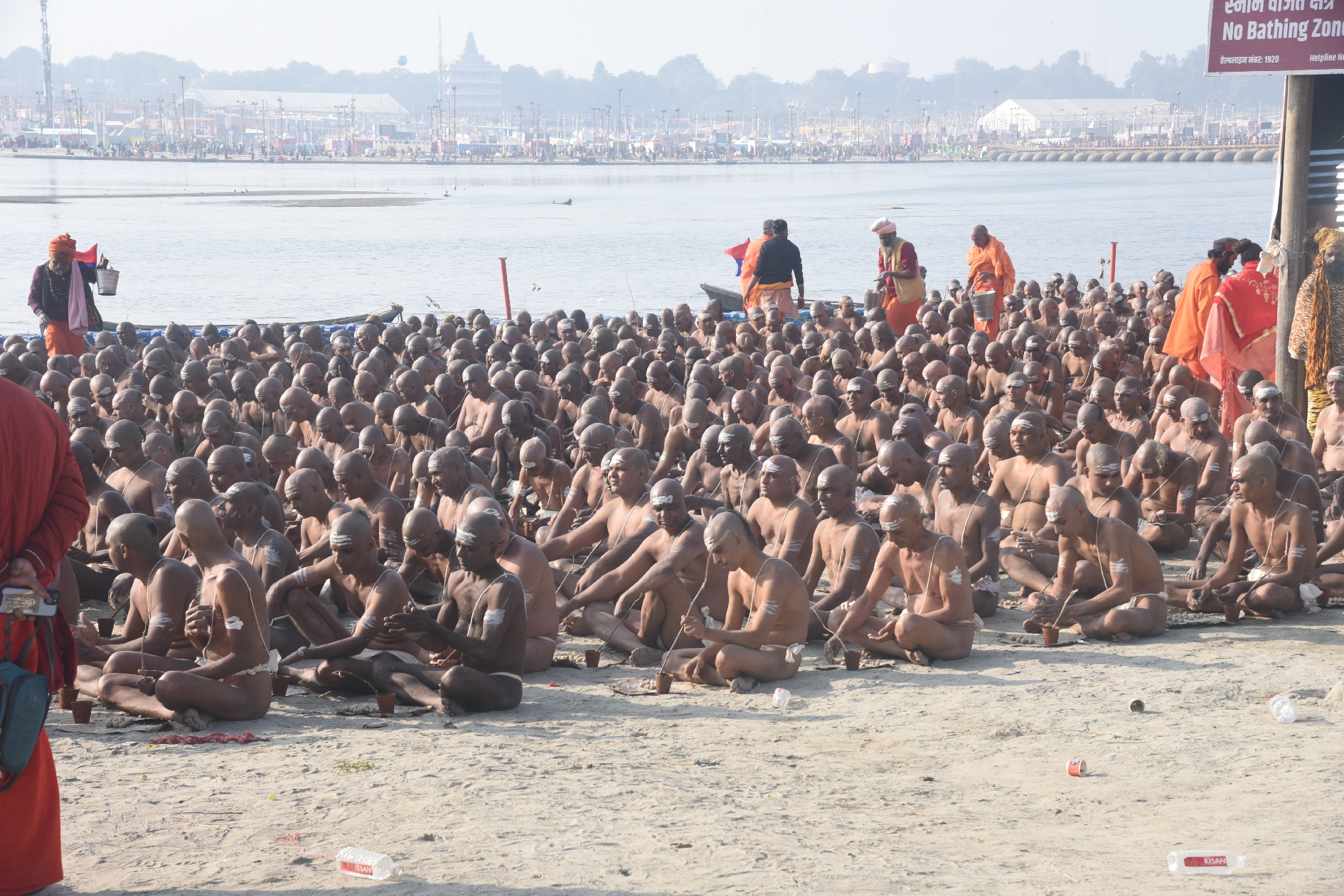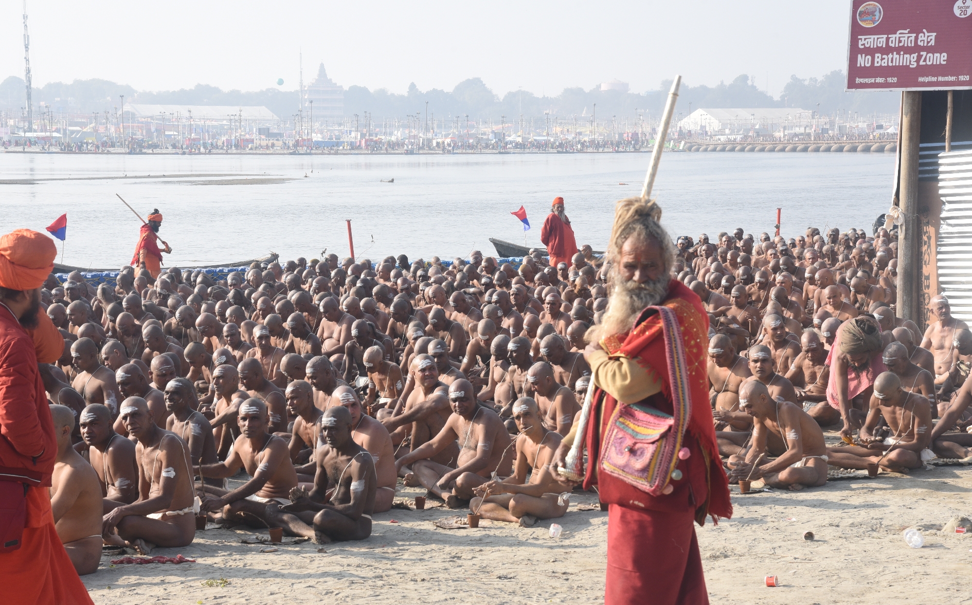 रमता पंच के श्रीमहंत निरंजन भारती, रामचंद्र गिरि, मोहन गिरि और दूध पुरी की देखरेख में सबका मुंडन कराया गया। इसके बाद गंगा में मंत्रोच्चार के बीच 108 बार डुबकी लगवाई गई। फिर गंगा पूजन करके पिंडदान की प्रक्रिया आरंभ हुई।