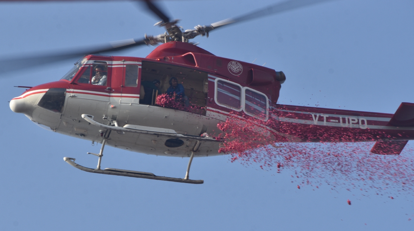 माघी पूर्णिमा पर बुधवार को गंगा स्नान में स्नान कर रहे श्रद्धालुओं पर पुष्पवर्षा करता हेलीकॉप्टर। -कासिम खान