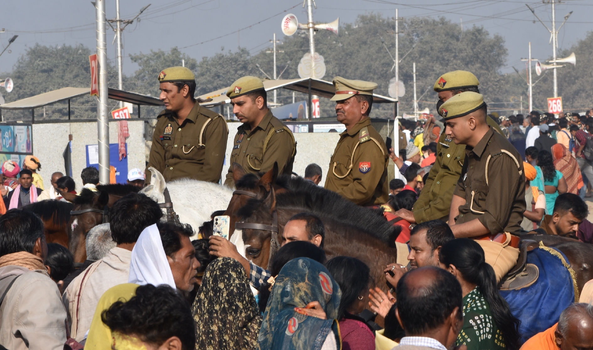 माघी पूर्णिमा पर बुधवार को संगम किनारे घोड़ाें पर तैनात पुलिसकर्मी। -कासिम खान