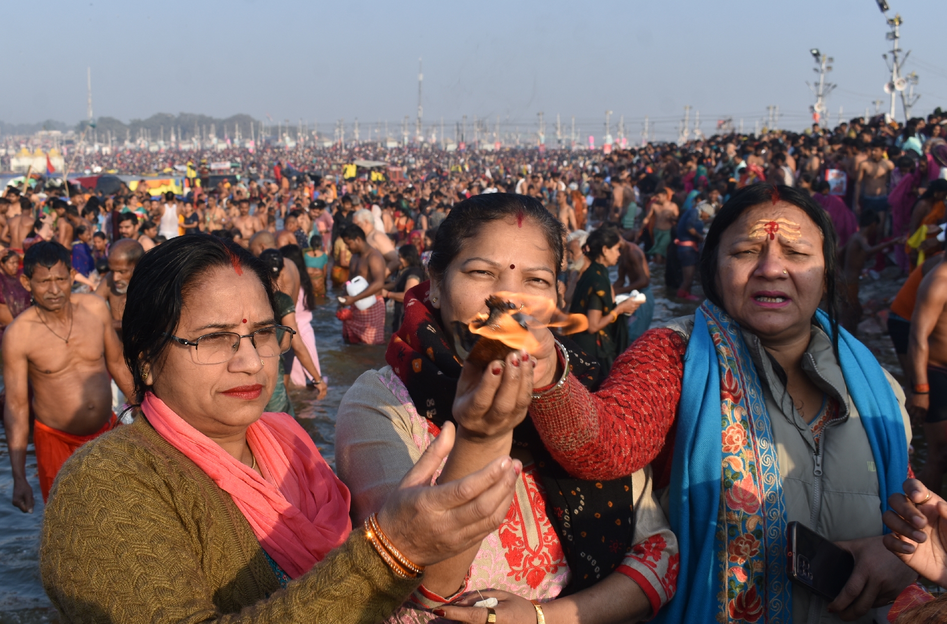 माघी पूर्णिमा पर बुधवार को गंगा स्नान के दौरान आरती करतीं श्रद्धालु। -कासिम खान