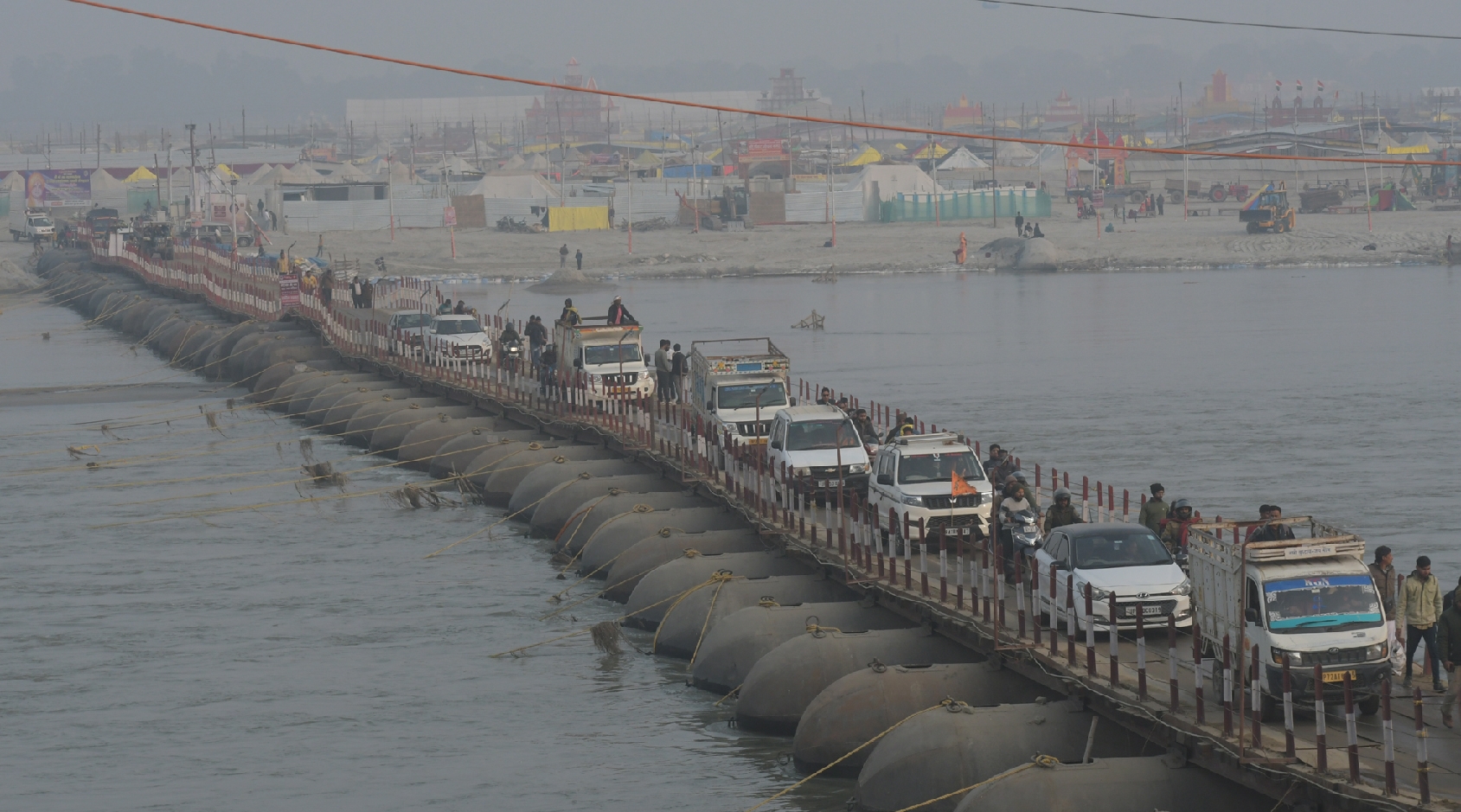 Maha Kumbh Mela 2025 में पीपा पुल से गुजरते श्रद्धालुओं के वाहन।-जागरण