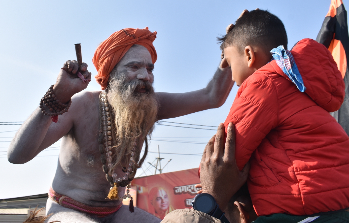 Maha Kumbh में गंगा स्नान के बाद बालक को आशीर्वाद देते नागा सन्यासी। फोटो- कासिम खान