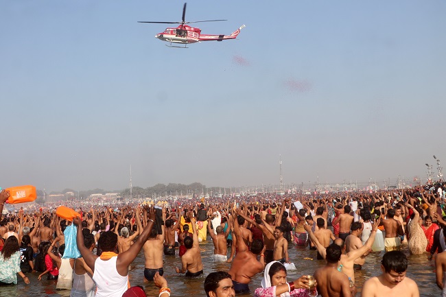 माघी पूर्णिमा के प्रमुख स्नान पर्व पर बुधवार को संगम तट पर डुबकी लगाने पहुंचे असंख्य श्रद्धालुओं पर योगी सरकार ने हेलीकॉप्टर से पुष्प वर्षा की परंपरा को जारी रखा। हेलीकॉप्टर से सभी घाटों पर स्नान कर रहे श्रद्धालुओं, साधु संतों और कल्पवासियों पर फूलों की वर्षा की गई।
