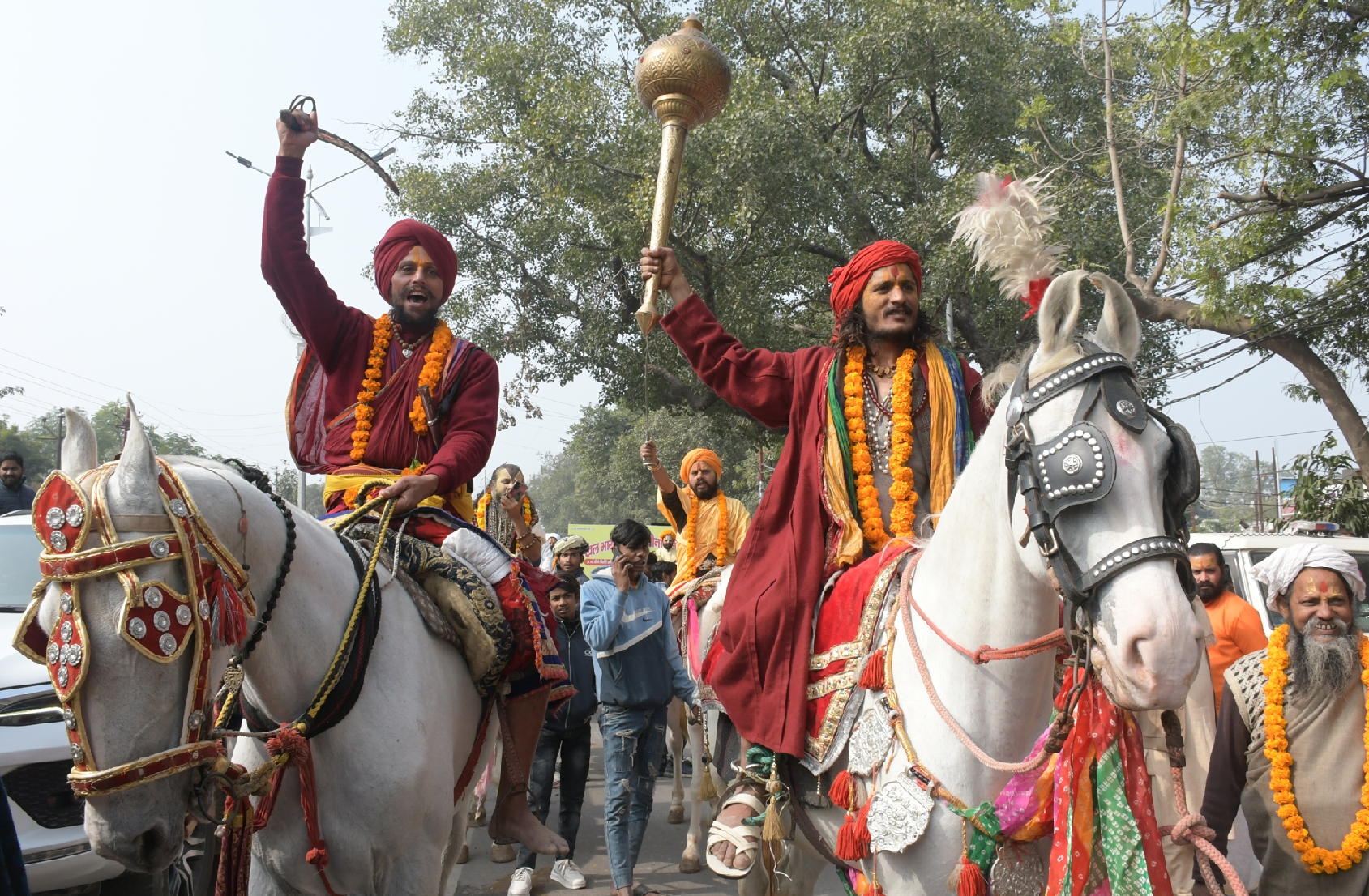 अखिल भारतीय वैष्णव तीनों अनी अखाड़े के छावनी प्रवेश शोभायात्रा में घोड़े पर सवार संत-महात्मा। गिरीश श्रीवास्तव