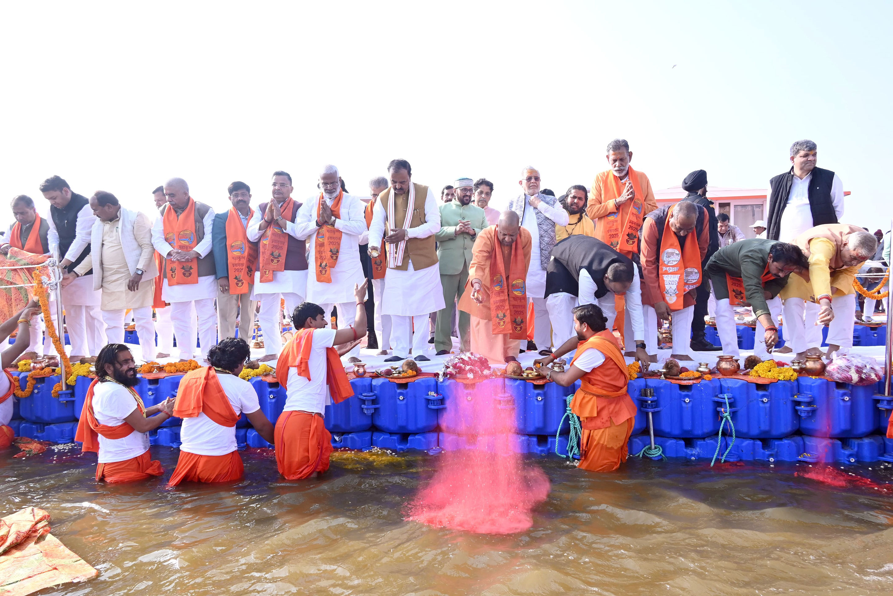 मुख्यमंत्री ने संगम में डुबकी लगाने के साथ पानी की बौछार भी की। स्नान के बाद पूजा-अर्चना की। पूजन की तस्वीरें भी सीएम ने एक्स के माध्यम से साझा की हैं। सीएम योगी ने लिखा कि आज प्रयागराज में मंत्रिमंडल के मा. सदस्यों के साथ 'विष्णुपदी' माँ गंगा का पूजन-अर्चन एवं आरती करने का सौभाग्य प्राप्त हुआ।