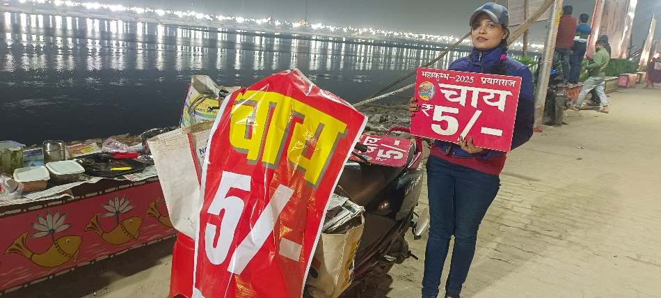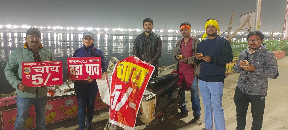रात के लगभग 12 बज रहे थे। हाथ में लाल रंग का एक बोर्ड लिए एक युवती आने-जाने वाले श्रद्धालुओं के लिए आकर्षण का केंद्र बनी थी। दर्जनों की संख्या में लोग खड़े होकर चाय पी रहे। कुछ वड़ापाव खा रहे । बोर्ड में लिखा है महाकुंभ-2025 चाय केवल पांच रुपये में.....।