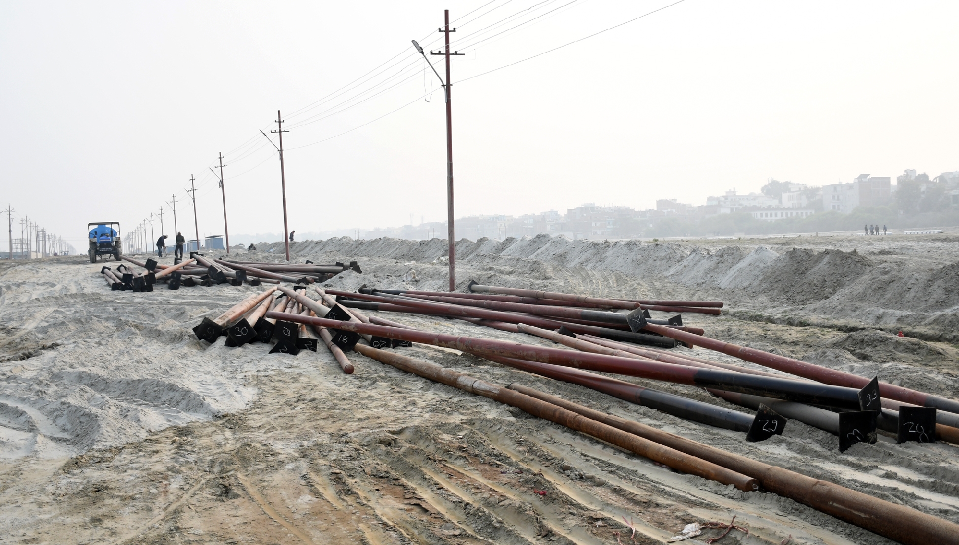 महाकुंभ की तैयारी को लेकर मेला क्षेत्र सेक्टर-9 में बिजली के तार लगाने के लिए गिराये गए पोल। जागरण