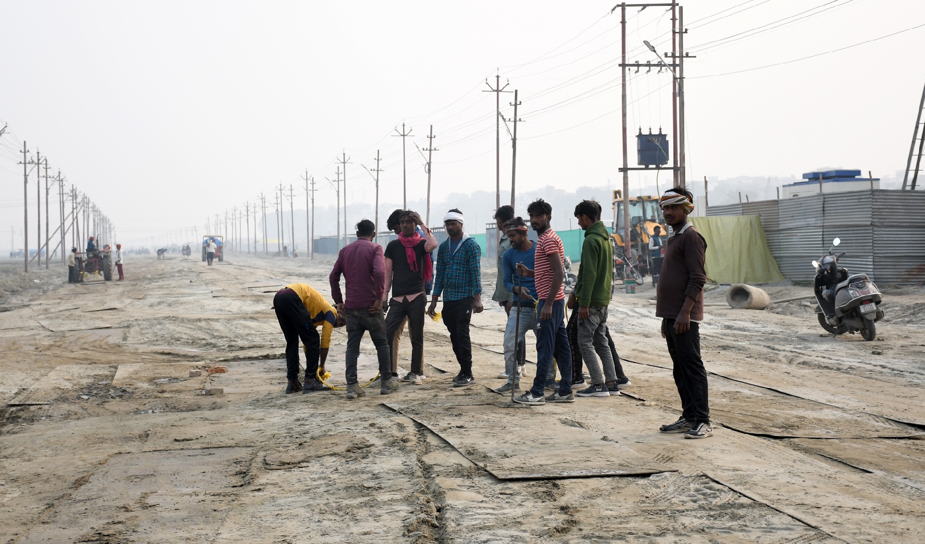 महाकुंभ की तैयारी को लेकर मेला क्षेत्र सेक्टर-8 में चकर्ड प्लेट बिछाते श्रमिक। जागरण