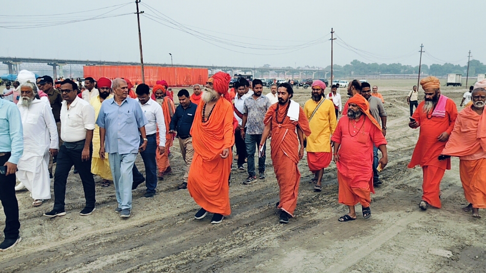महाकुंभ-2025 में अखाड़ों को भूमि आंवटन के लिए संत-महात्मा को जमीन दिखाते प्रयागराज मेला प्राधिकरण के अधिकारी। जागरण