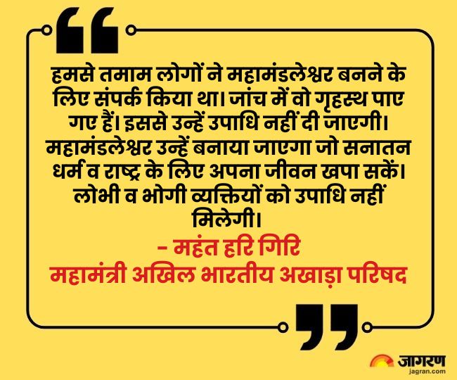 अखाड़ों को बताया था कि उनका अपने परिवार, सगे-संबंधियों से संपर्क नहीं है। कुछ ने एक-दो वर्ष, कइयों ने छह माह से विरक्त जीवन व्यतीत करने की बात कहकर महामंडलेश्वर बनाने का आग्रह किया था। अखाड़ों ने गुप्त जांच करवायी तो दावा झूठा मिला। महाकुंभ में समस्त अखाड़े लोगों को संन्यास दिलाने के साथ महामंडलेश्वर की उपाधि प्रदान करते हैं।