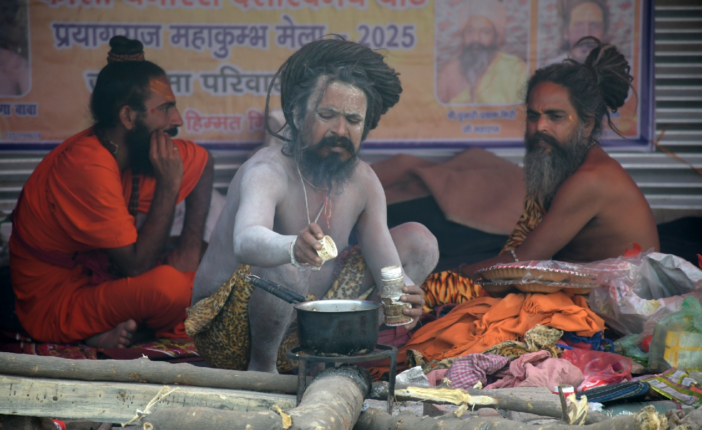 महाकुंभ मेला के आवाहन अखाड़े में धुनीं पर चाय बनाते नागा संत।-जागरण