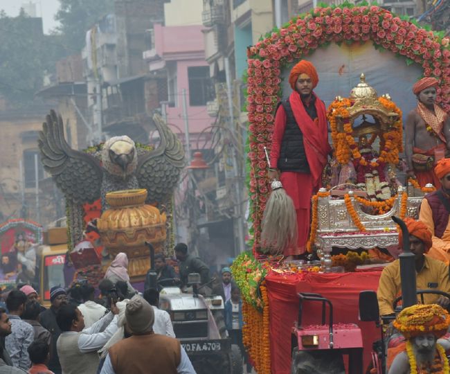 महाकुंभ नगर : बहादुरगंज में पंचायती अखाड़ा बडा उदासीन निर्वाण के छावनी प्रवेश शोभायात्रा में निकली भगवान श्रीचंद्र देव की पालकी ।-गिरीश श्रीवास्तव