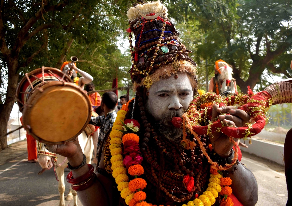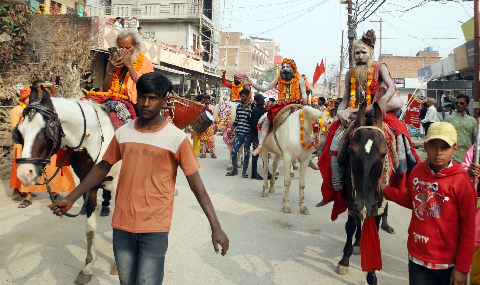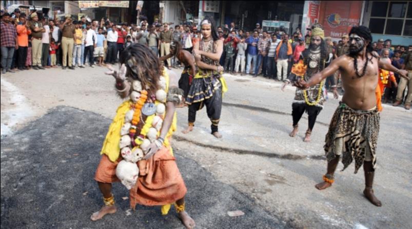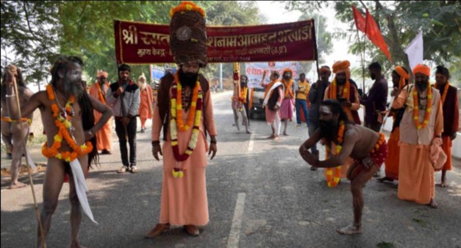 नगर प्रवेश में घोड़ों पर सवार होकर नागा साधु चले। कुछ अघोरी की वेष में करतब दिखा रहे थे। इनके पीछे अखाड़े की धर्म ध्वजा लेकर संत चल रहे थे।