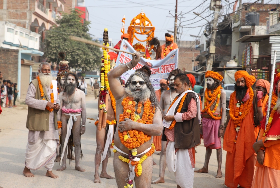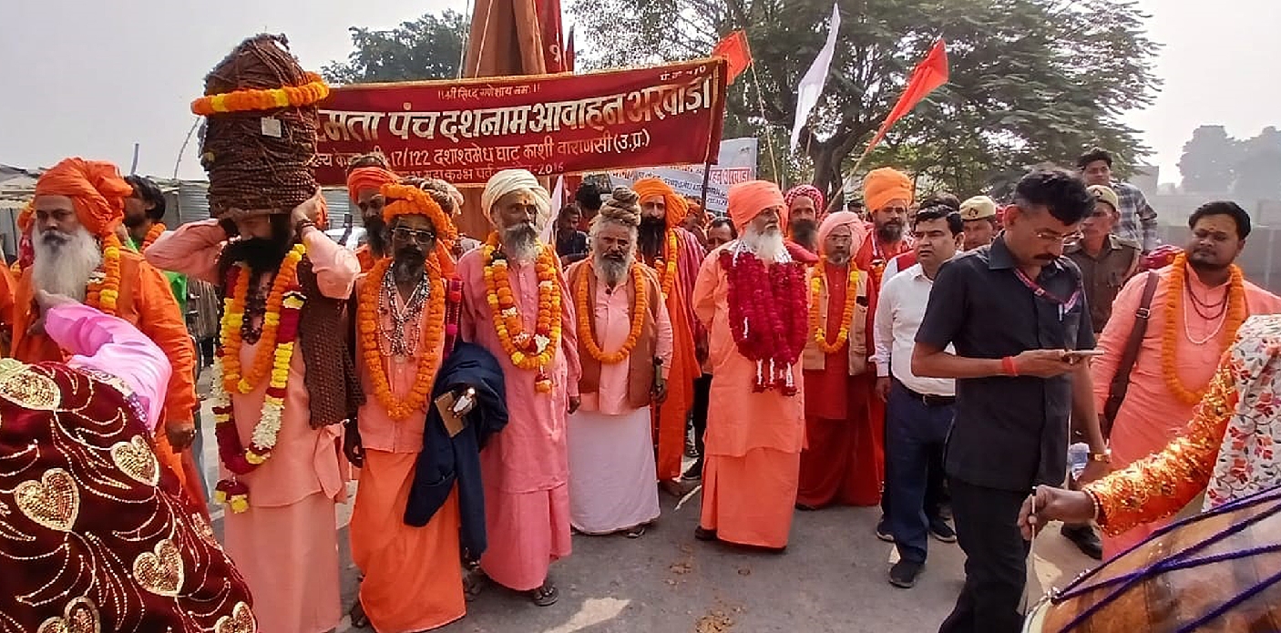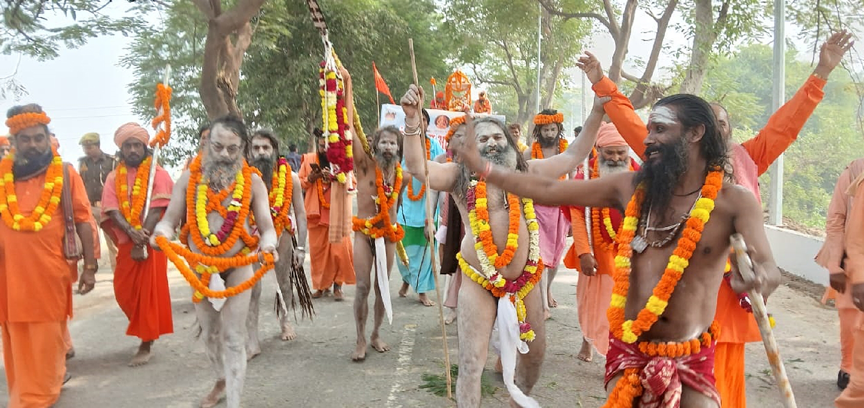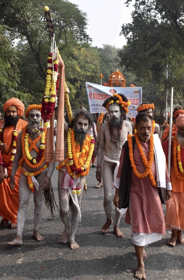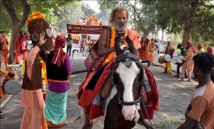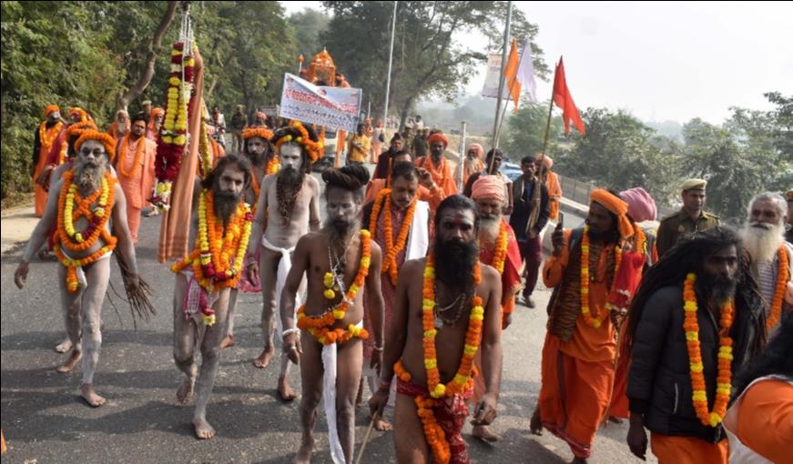 श्री पंच दशनाम आवाहन अखाड़ा के नगर प्रवेश यात्रा में शामिल संत-महात्मा। जागरण