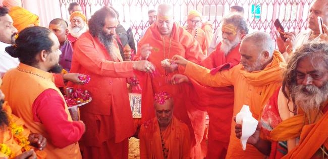 महामंडलेश्वर का अभिषेक करते श्रीनिरंजनी अखाड़ा के आचार्य महामंडलेश्वर कैलाशानंद गिरि, अखिल भारतीय अखाड़ा परिषद व मनसा देवी ट्रस्ट के अध्यक्ष श्रीमहंत रवींद्र पुरी व अन्य। जागरण आर्काइव