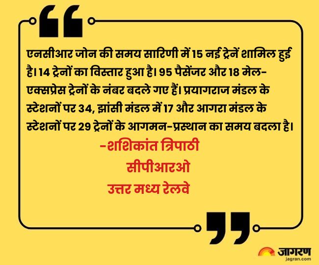 - कानपुर में 16, टुंडला में 11, अलीगढ़ में सात, हाथरस में तीन, इटावा में पांच, फतेहपुर में दो, मीरजापुर में एक ट्रेन का समय बदला है।