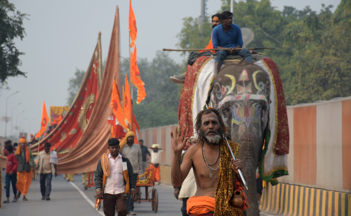 Maha Kumbh 2025:चौफटका आरओबी से गुजरता श्री शंभू पंच अग्नि अखाड़ा की छावनी प्रवेश शामिल हाथी। जागरण