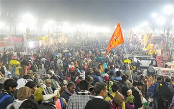 यह भी बार-बार माइक से अनाउंस किया जा रहा है कि श्रद्धालु अपने बच्चों को कंधे पर बैठा कर चलें, किसी को धक्का न मारें। धीरे-धीरे बढ़ें।