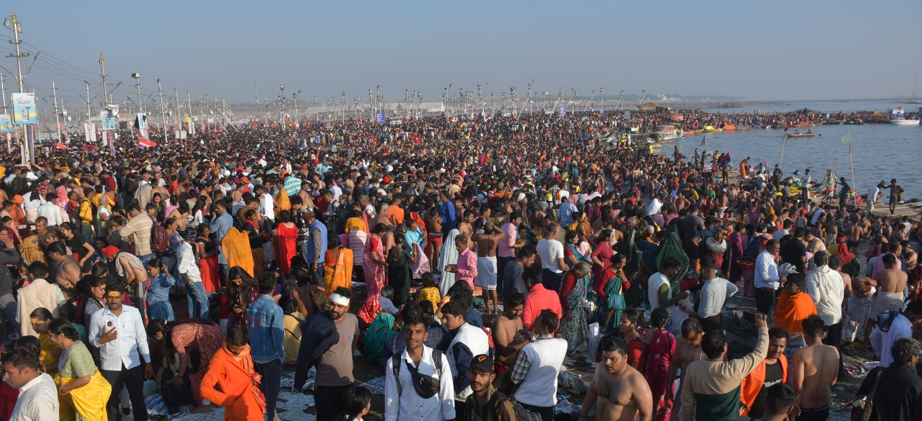संगम तट के सभी घाट स्नानार्थियों से फुल थे। पुलिस ने डायवर्जन प्लान लागू कर सभी 44 घाटों पर भीड़ भेजना शुरू किया, फिर भी संगम तट दिन भर पैक था।