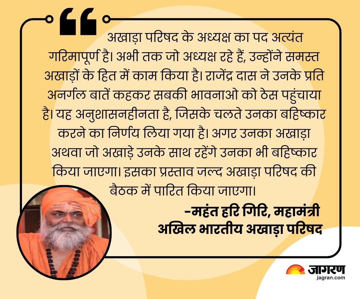 अखाड़ा परिषद के अध्यक्ष का पद अत्यंत गरिमापूर्ण है। अभी तक जो अध्यक्ष रहे हैं, उन्होंने समस्त अखाड़ों के हित में काम किया है। राजेंद्र दास ने उनके प्रति अनर्गल बातें कहकर सबकी भावनाओ को ठेस पहुंचाया है। यह अनुशासनहीनता है, जिसके चलते उनका बहिष्कार करने का निर्णय लिया गया है। अगर उनका अखाड़ा अथवा जो अखाड़े उनके साथ रहेंगे उनका भी बहिष्कार किया जाएगा। इसका प्रस्ताव जल्द अखाड़ा परिषद की बैठक में पारित किया जाएगा।