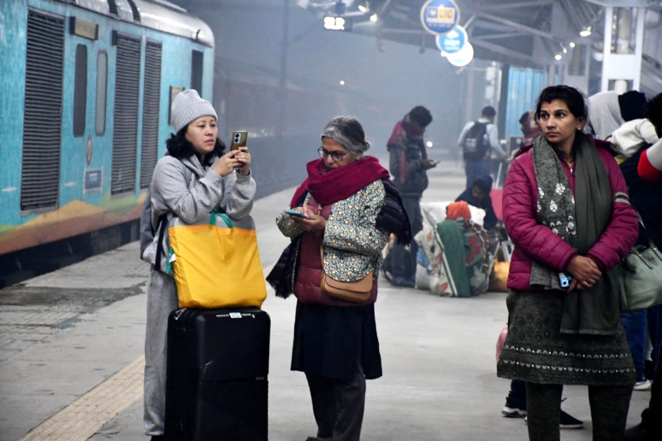 ठंडी और धुंध भरी सर्दियों में रेलवे स्टेशन पर यात्री ट्रेनों का इंतजार करते हुए। जागरण